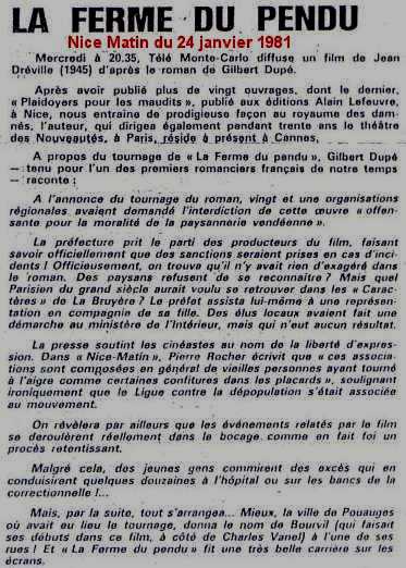ARTICLE DE PRESSE"La Ferme du Pendu"Article daté de 1981: Publication intéressante au sujet des rivalités rencontrées par l'auteur, par exempleDEBOIRES de LA FERME DU PENDU. |